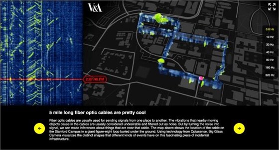 這種可視化,即“Big Glass Microphone”能夠在十分鐘以內把電纜中的數據提取出來,這些電纜以傾斜向一邊的8字形狀埋在地下6英寸深處。從可視化數據圖中,我們很容易可以看到三種不同程度的振動波動,分別是汽車、大型噴泉和自行車行人造成的波動。受全球最大裝飾和設計藝術館維多利亞和阿爾伯特博物館(Victoria and Albert Museum)的委托,這項可視化工程將會于2018年在館內展示。